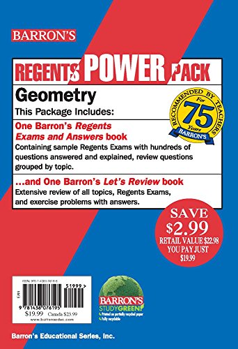Barron's Regents Exams and Answers: Geometry and Barron's Let's Review Geometry are available as a two-book set. Buy them together and find the first two actual Regents exams administered for the updated Geometry Regents with all answers thoroughly explained; tips and test-taking strategies; thorough reviews and practice problems on basic geometric relationships (parallel lines, polygons, and triangle relationships), an introduction to geometric proof transformations, similarity and right triangle trigonometry, parallelograms, volume (modeling 3-D shapes in practice applications), and more.
